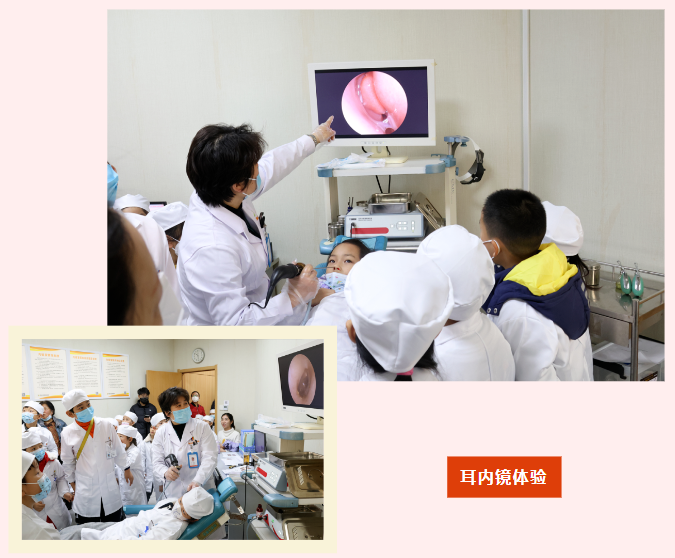 学习完耳鼻喉知识,在工作人员的引领下,小医生们依次“打卡”内镜室、测听室、中医科、治疗室、听力中心等科室。当通过医生的小镜子,亲眼看到自己耳朵、鼻子的内部结构时,孩子们既开心又兴奋。