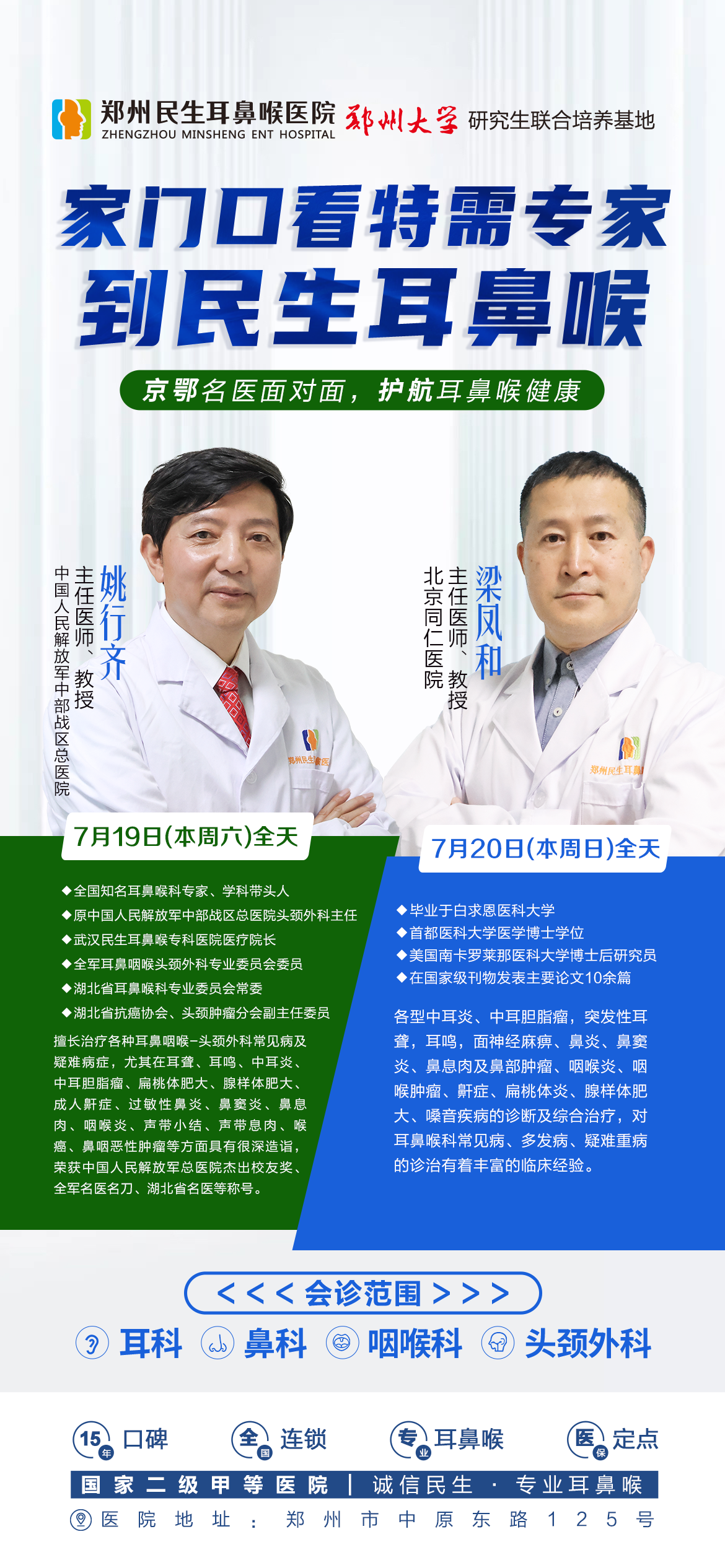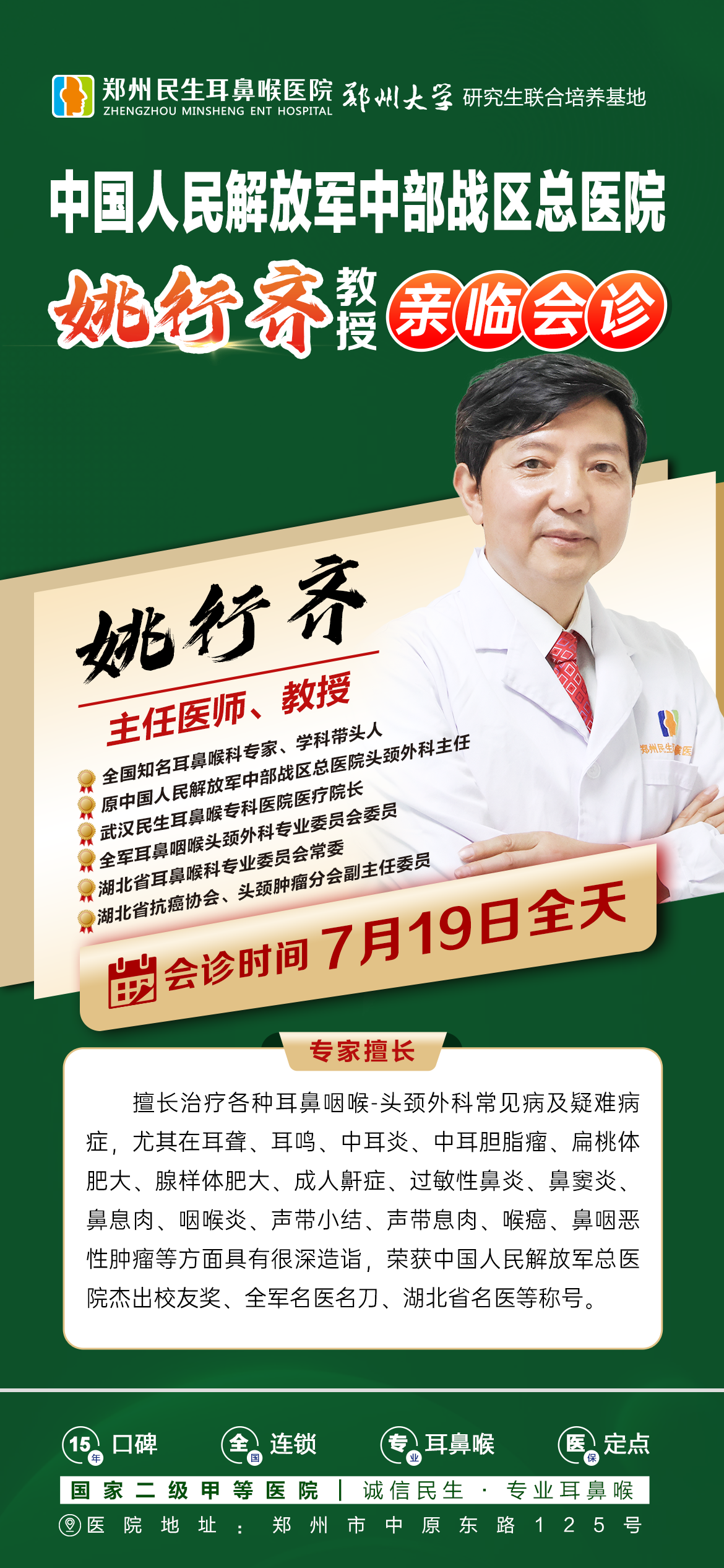 7月19-20日,中国人民解放军中部战区总医院姚行齐教授、北京同仁医院耳鼻喉专家梁凤和教授亲临郑州民生耳鼻喉医院,为郑州及周边患者提供专业、高效、精准的诊疗服务!
