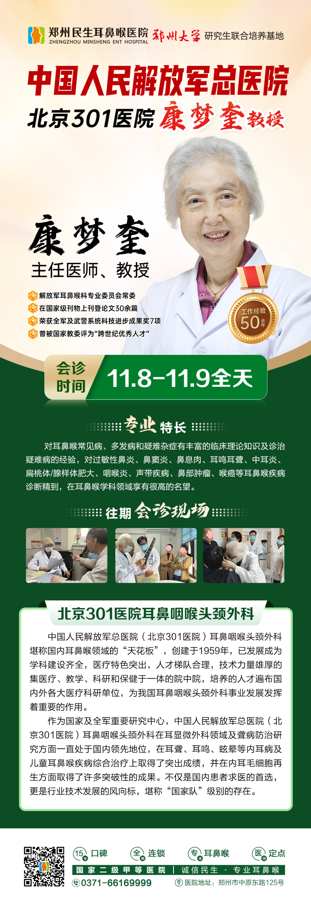 ?? 为帮助更多患者在家门口享受优质诊疗资源,11月8-9日(周六、周日)全天,北京301医院康梦奎教授亲临郑州民生耳鼻喉医院,开展两天限号会诊查房。