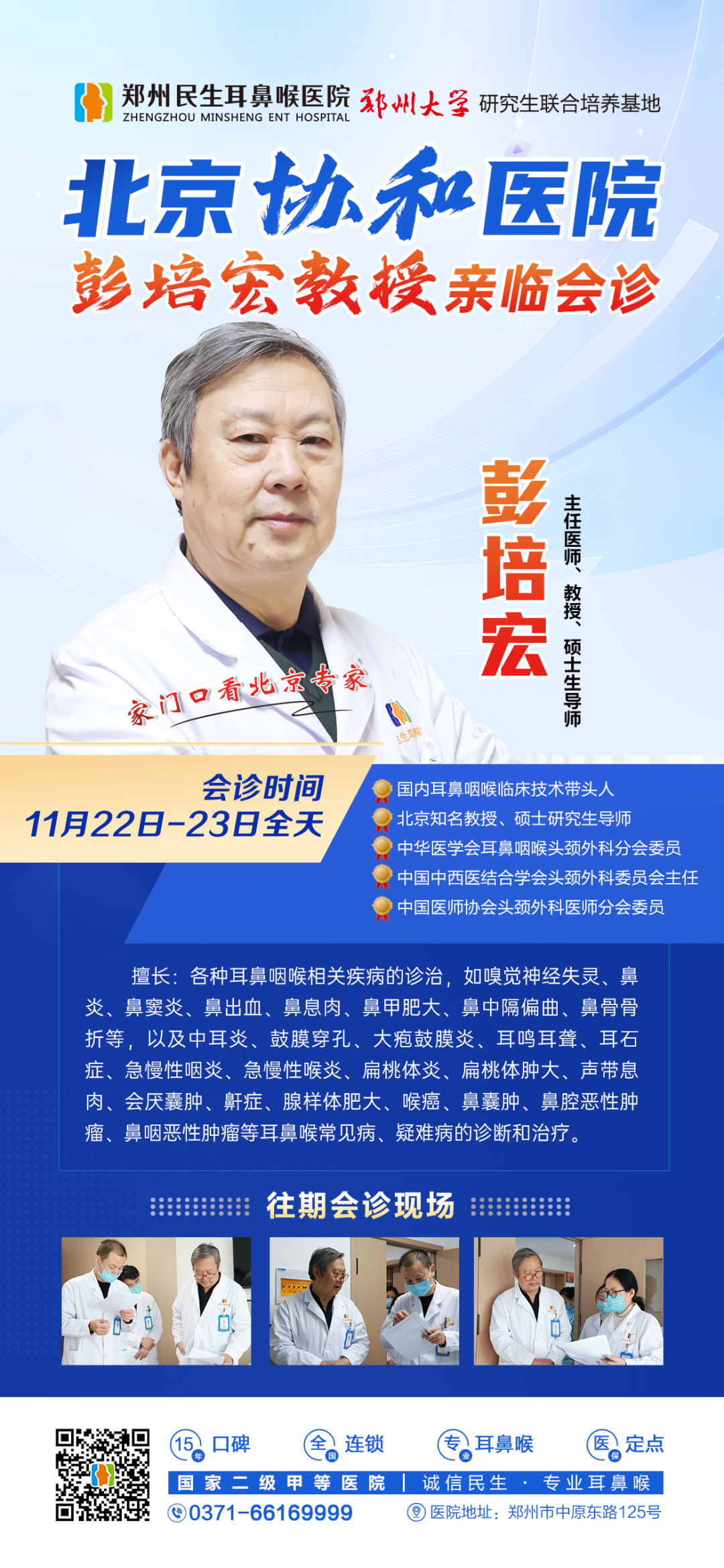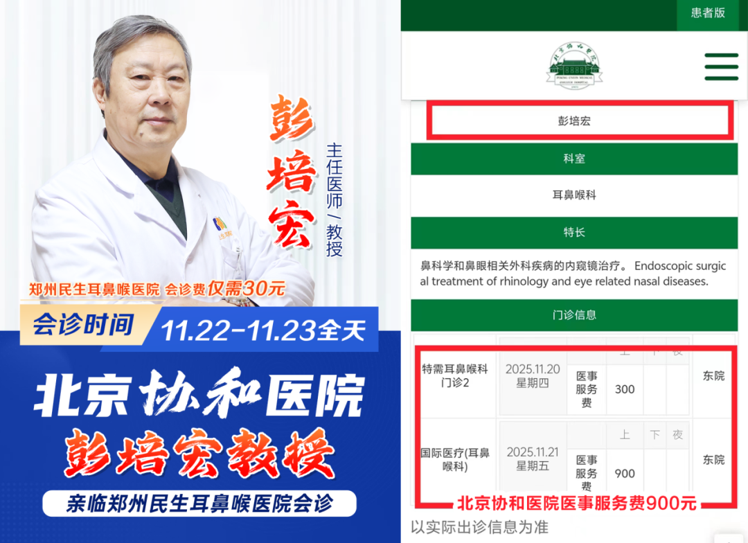 11月22—23日(周六、周日),北京协和医院耳鼻喉专家彭培宏教授将亲临郑州民生耳鼻喉医院限号会诊,不必远行,即可获得北京专家的面对面诊疗与指导。